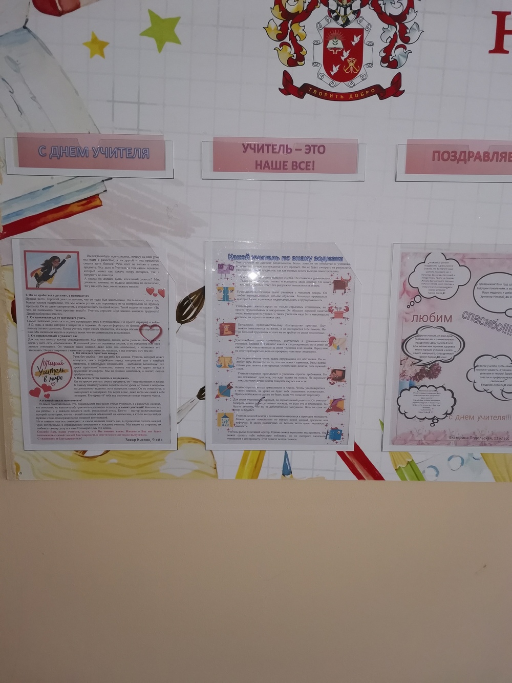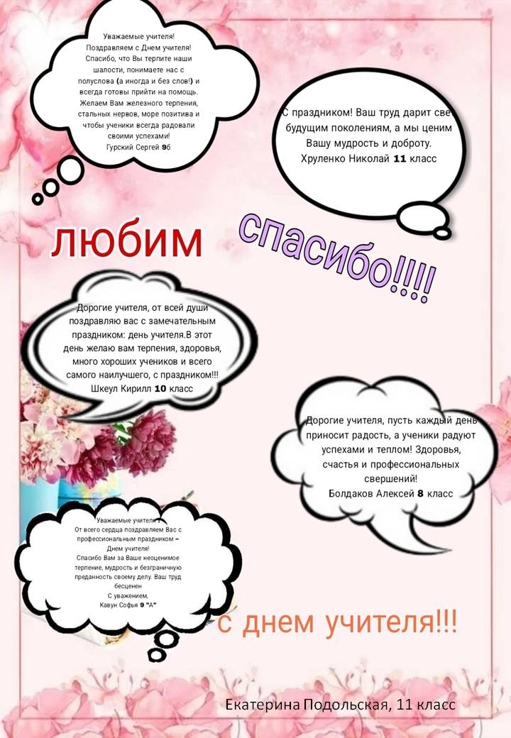 3 октября, в канун Всемирного Дня учителя, в Таганрогском филиале ГКОУ РО «Ростовская-на-Дону санаторная школа-интернат № 74» прошел калейдоскоп творческих дел, посвященных Дню Учителя. Прежде всего, учащиеся 11 класса на несколько уроков стали учителями, что позволило им убедиться, насколько нелёгок труд педагога. Корреспонденты школьной газеты подготовили специальный выпуск газеты «Наша жизнь», а каждый класс, втайне от педагогов, выпустил плакат с поздравлениями для учителей. Совет самоуправления позаботился о том, чтобы на переменах звучала праздничная музыка, были украшены двери классов и фойе, а отряды приготовили разнообразн6ые букеты с тематическими названиями. Завершением этого праздничного дня стала театрализованная программа «С любовью к учителям», в которой приняли участие все классы. Ребята подготовили стихи, сценки, песни, телепередачу и фильм о педагогах нашей школы. Выпускники разных лет прислали видео поздравления учителям, воспитателям и педагогам дополнительного образования, что особенно их тронуло. Праздничный день получился ярким, насыщенным и запоминающимся.
