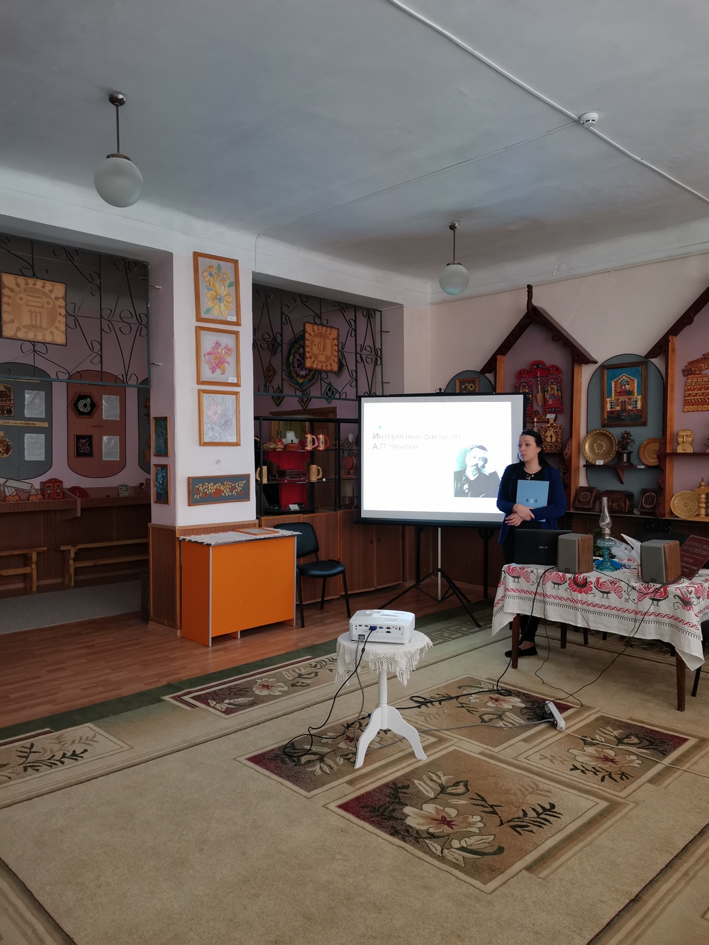 Педагог-библиотекарь Яровенко В.М. для обучающихся 6 класса провела литературный час «С любовью к Чехову», познакомила с интересными фактами жизни и творчества писателя. Литературный час сопровождался презентацией. Ребята узнали о детстве писателя, об учёбе в университете и о его поездке на Сахалин.