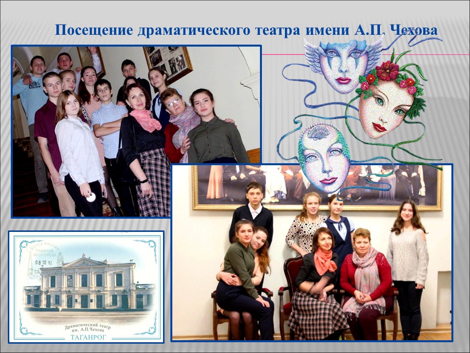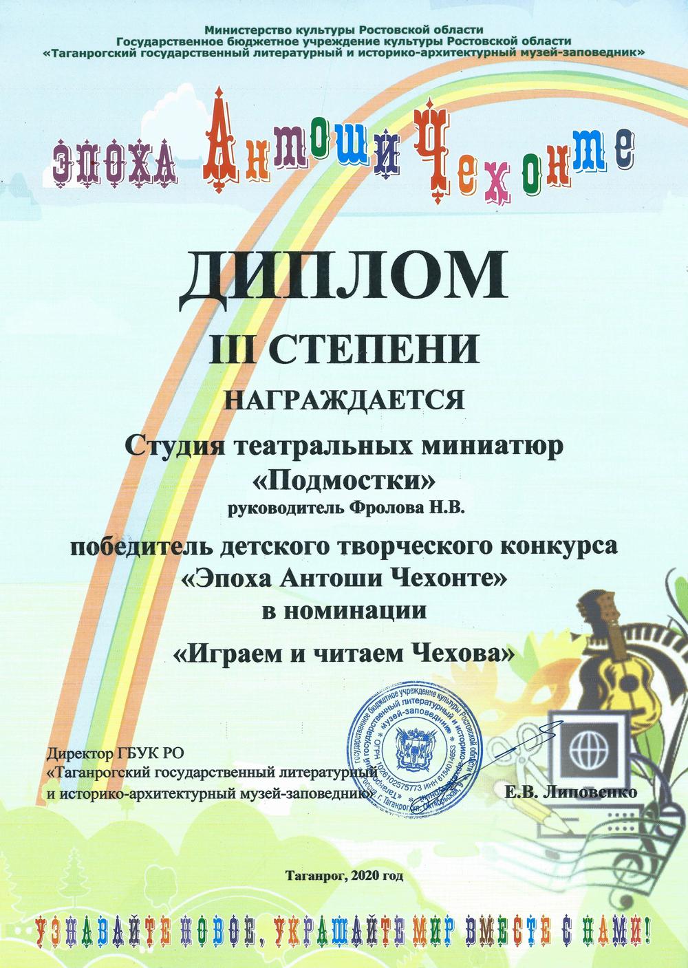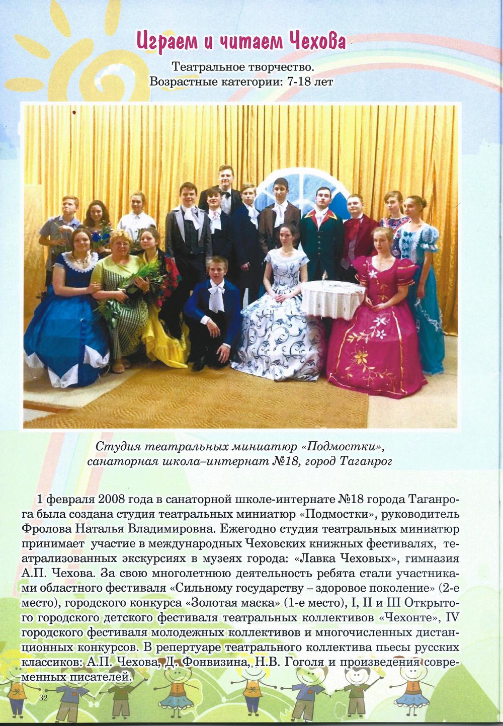 В номинации «Подарок на день рождения А.П. Чехову» (направление – детское декоративно-прикладное творчество) учащаяся 9 класса А. Стаценко (работа «Дама с собачкой») заняла II место (руководитель Сазоненко Е.А.). Студия театральных миниатюр «Подмостки» (руководитель Фролова Н.В.) заняла III место в номинации «Играем и читаем Чехова» (спектакль по произведениям А.П. Чехова «Завтра мы станем счастливее»).