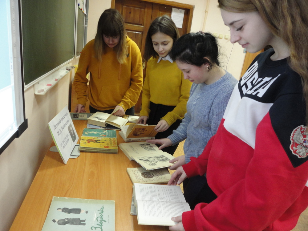 К этой дате в фойе школы была оформлена книжная выставка «Иван Дмитриевич Василенко – детский писатель». В библиотеке проведены громкие чтения его рассказов: «Волшебная шкатулка», «Приказ командира», «Полотенце», «Артёмка в цирке». Педагогом-библиотекарем, Яровенко В.М. с учащимися 5-7 классов были проведены библиотечные уроки «Люди нашего края. Детский писатель – И.Д.Василенко». Для обучающихся 5 класса была организована экскурсия в Дом-Музей И.Д. Василенко, где ребята еще раз могли прикоснуться к жизни и творчеству писателя большого и светлого таланта.