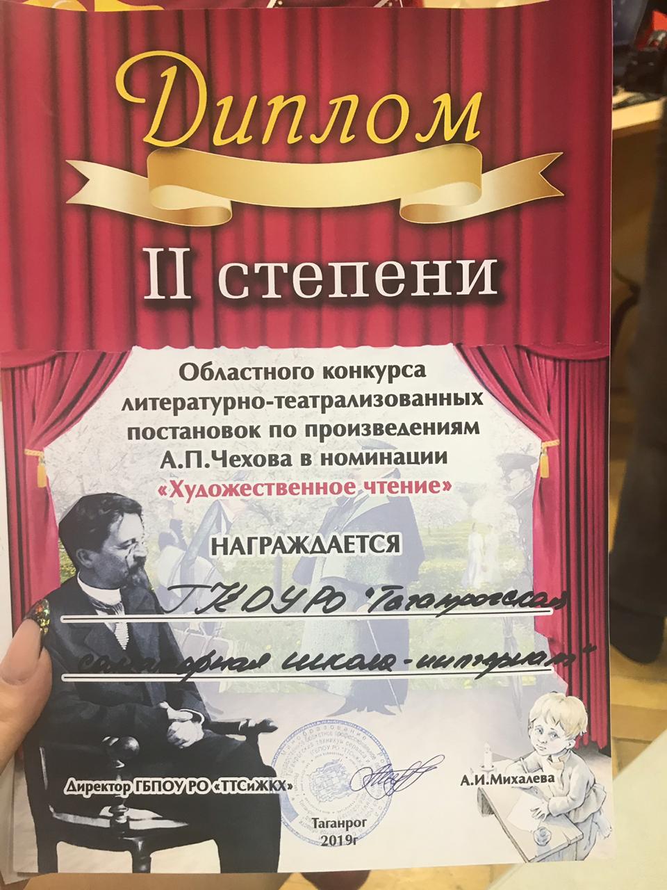 19 апреля 2019 года в ГБПОУ РО «ТТСиЖКХ» состоится областной конкурс литературно-театрализованных постановок по творчеству А.П.Чехова, который проводится в целях поддержки и развития литературно-театрального творчества обучающихся средних профессиональных учреждений образования Ростовской области. На данный конкурс были приглашены обучающиеся ГКОУ РО «Таганрогская санаторная школа - интернат». По итогам конкурса наши ребята заняли второе место.