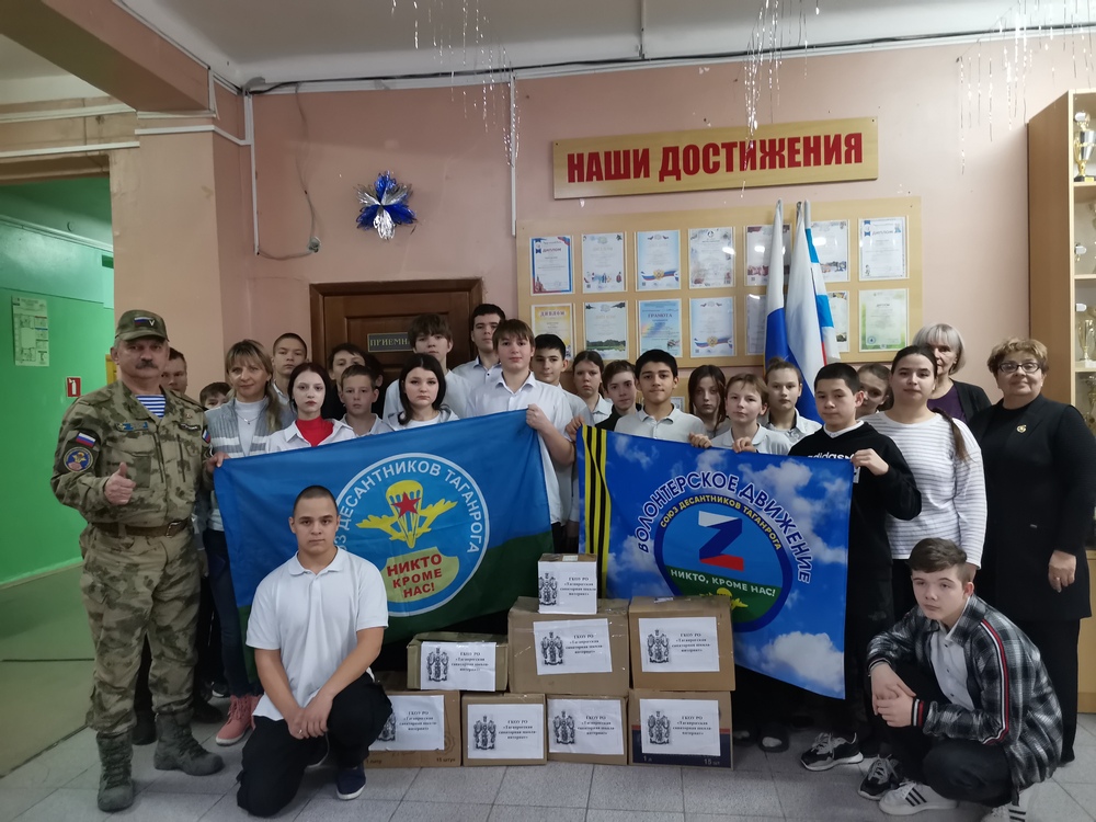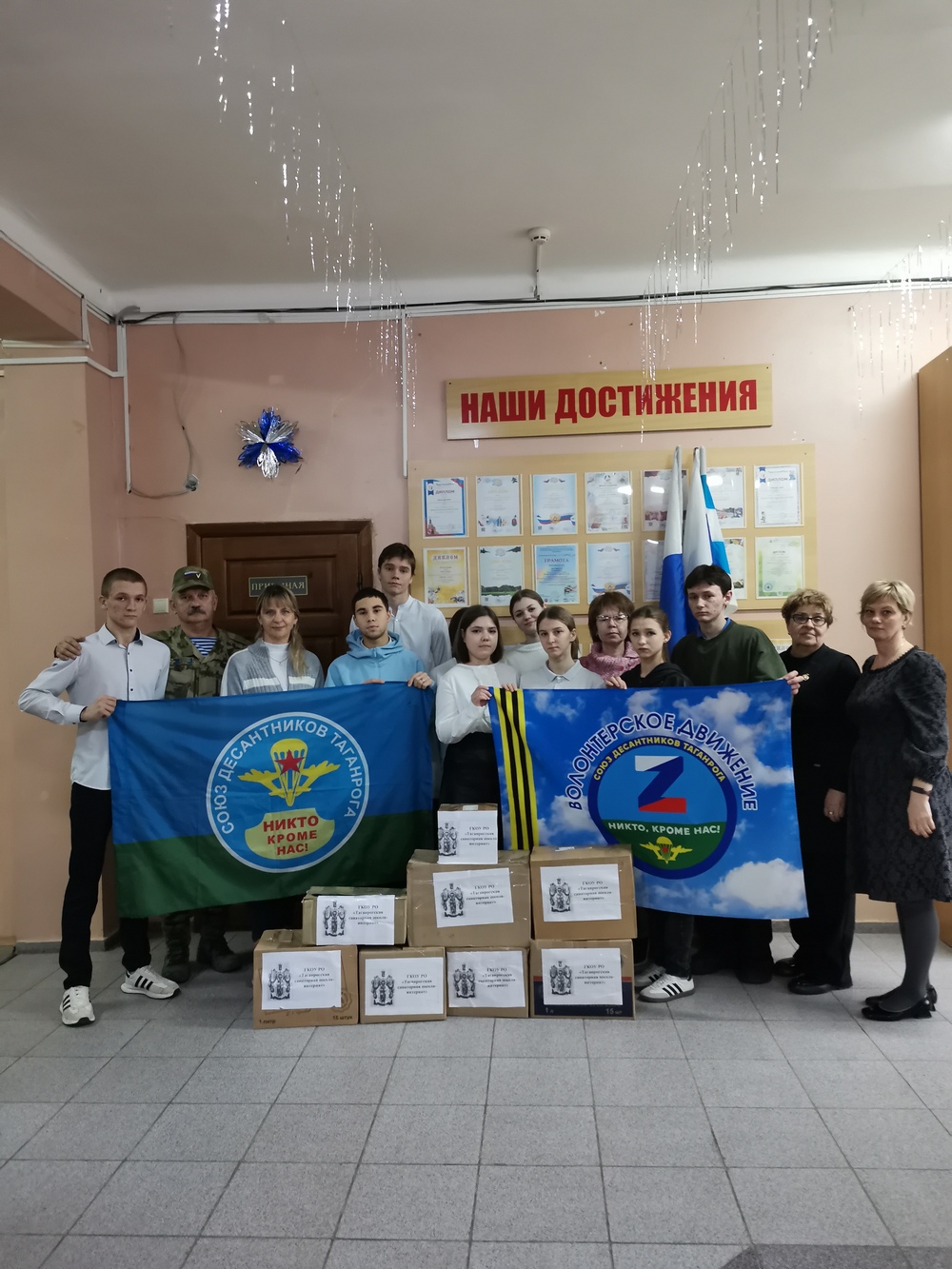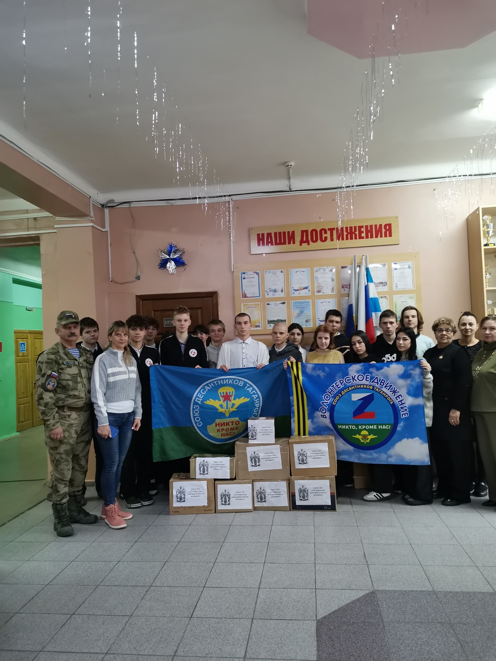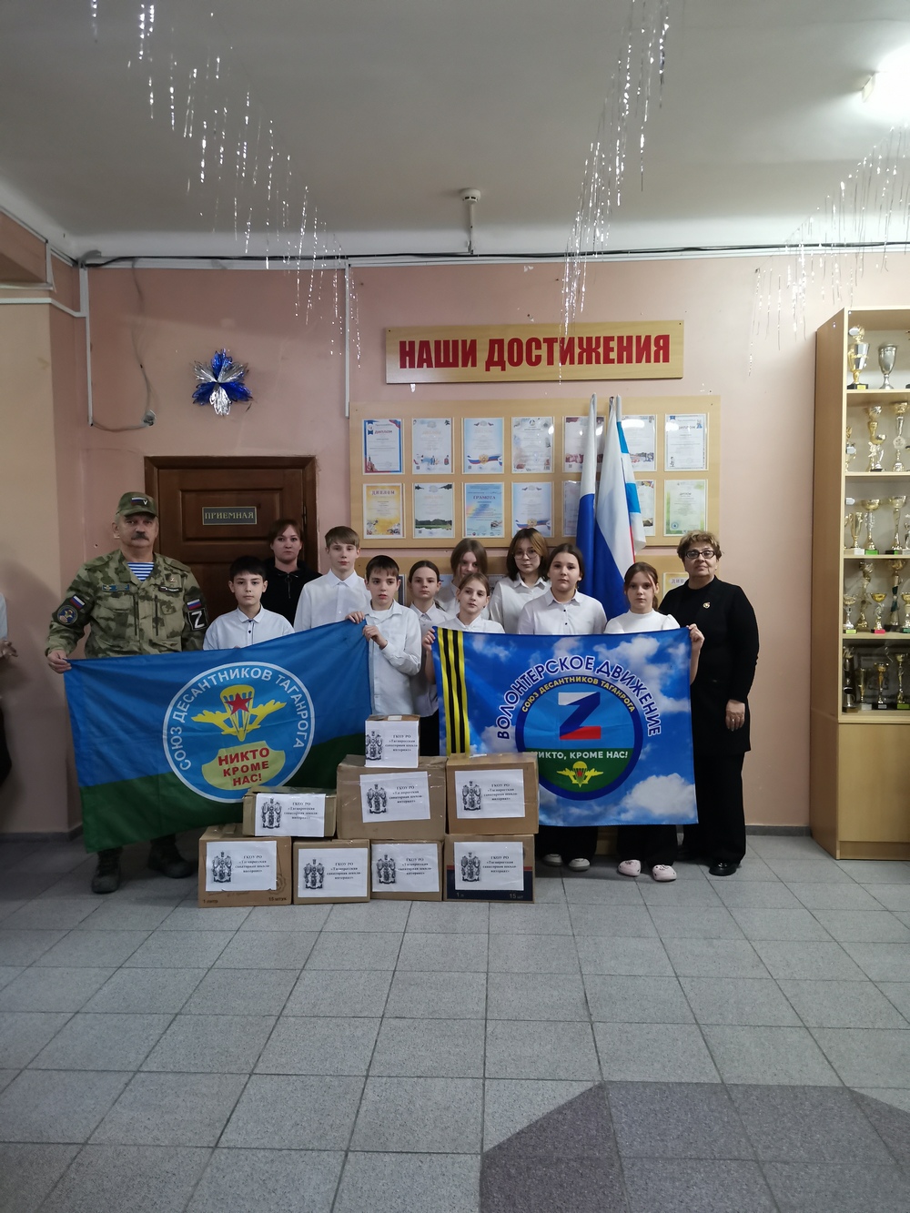 В преддверии Нового года в Таганрогском филиале ГКОУ РО «Ростовская-на-Дону санаторная школа-интернат № 74» прошла акция «От Деда Мороза – фронту». Педагоги и сотрудники школы, ребята и их родители приготовили для бойцов СВО новогодние подарки: продукты питания, предметы личной гигиены и самое главное – письма. В торжественной обстановке всё это было передано председателю Общественной Организации ветеранов военной службы «Союз Десантников Таганрога» Сетькову А.А. и представителям волонтерского движения «Никто, кроме нас» для доставки на фронт.
