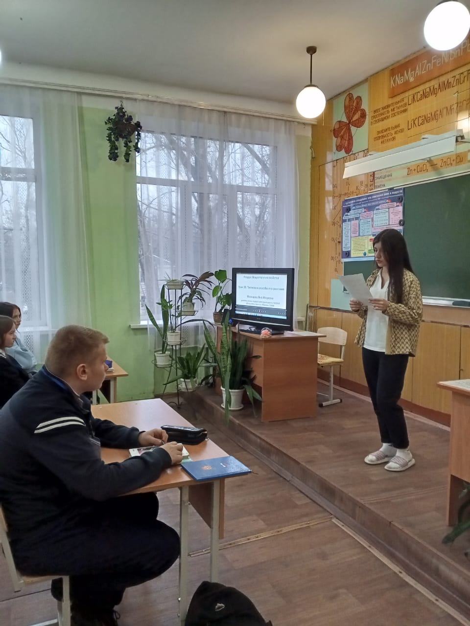 Ученица 9а Нелли Геворкян организовала лекторий "Тело человека" для 9-х классов и мероприятие "Я - соль Земли" для восьмиклассников, а София Шитова (10 класс) провела в 9а экоурок "По страницам Красной книги".