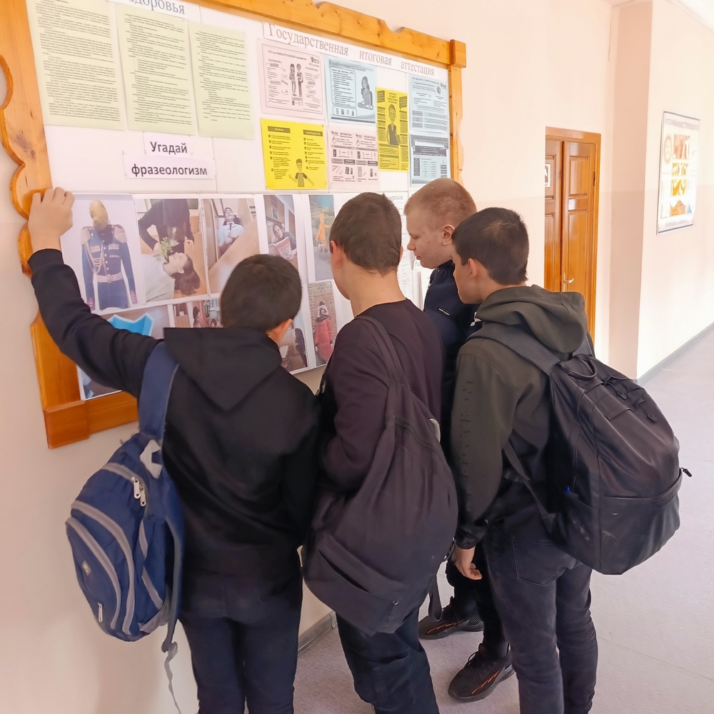 В рекреации первого этажа был оформлен информационный стенд «Реформы русского языка», на котором была представлена научная информация о реформации русского языка, а также стенд «Угадай фразеологизм», который пользовался большой популярностью. Ребята проявляли повышенный интерес, с удовольствием рассматривали фотографии и отгадывали фразеологизмы.
