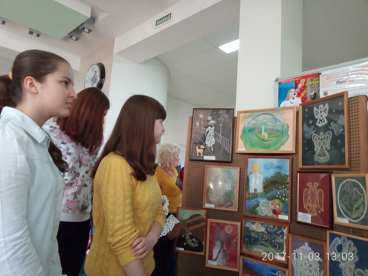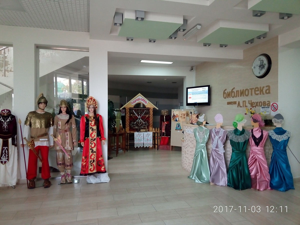 3 ноября 2017 года в городской библиотеке имени А.П. Чехова состоялось городское мероприятие «Таганрог – многонациональный», посвященное Дню народного единства. Гостями мероприятия была делегация из Крыма в составе 20 человек. По просьбе городского Отела Культуры педагоги ГКОУ РО «Таганрогская санаторная школа-интернат» в фойе библиотеки оформили выставку детского творчества в соответствии с тематикой мероприятия. На выставке были представлены работы декоративно-прикладного творчества, костюмы разных народов, выполненные в рамках общешкольного пятилетнего проекта «Эпох связующая нить».